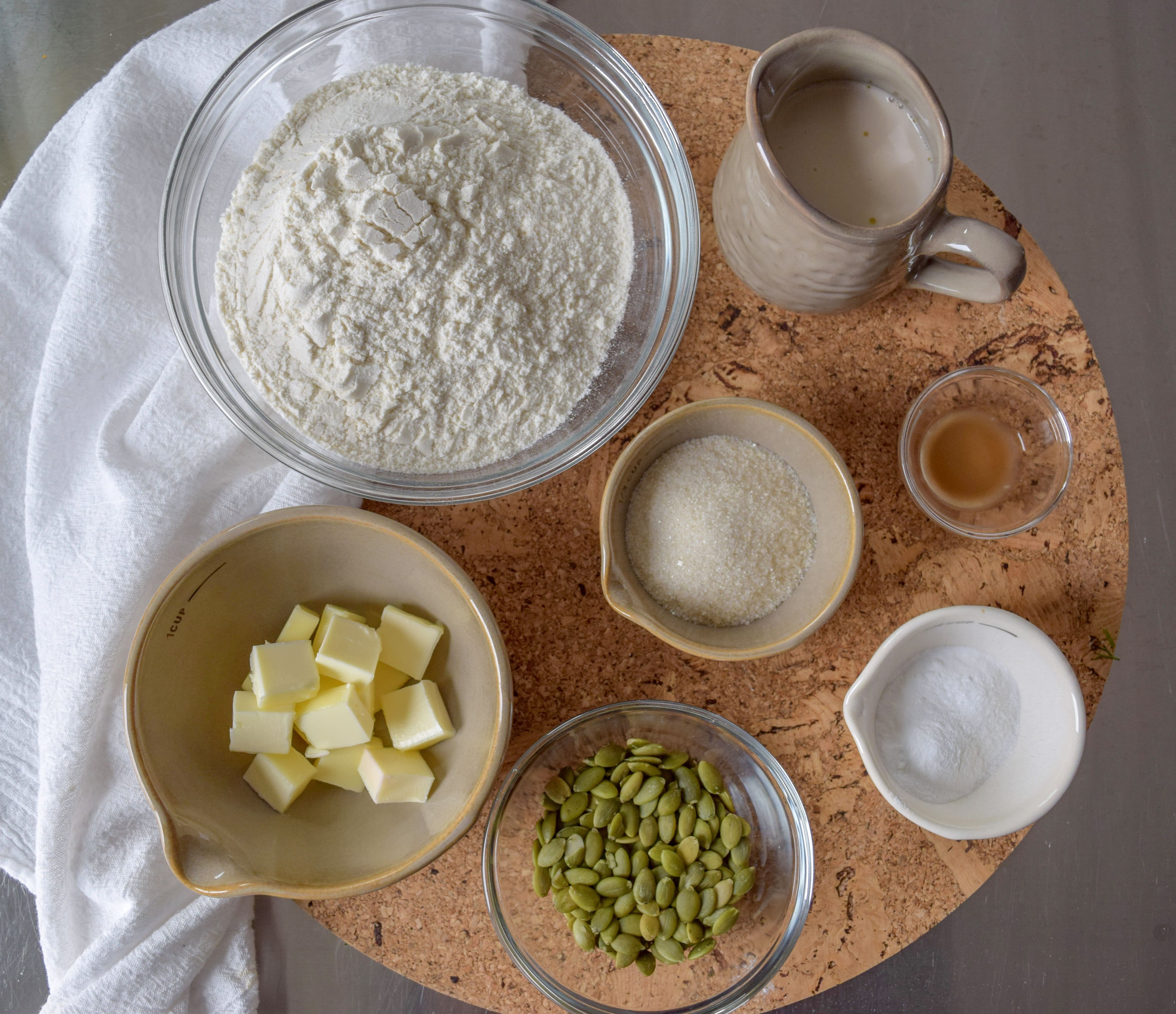 - To the new flour mixture add half of the pumpkin seeds, the reserved milk-vinegar mixture and the flax meal-water mixture. Stir until well combined and form into a ball.