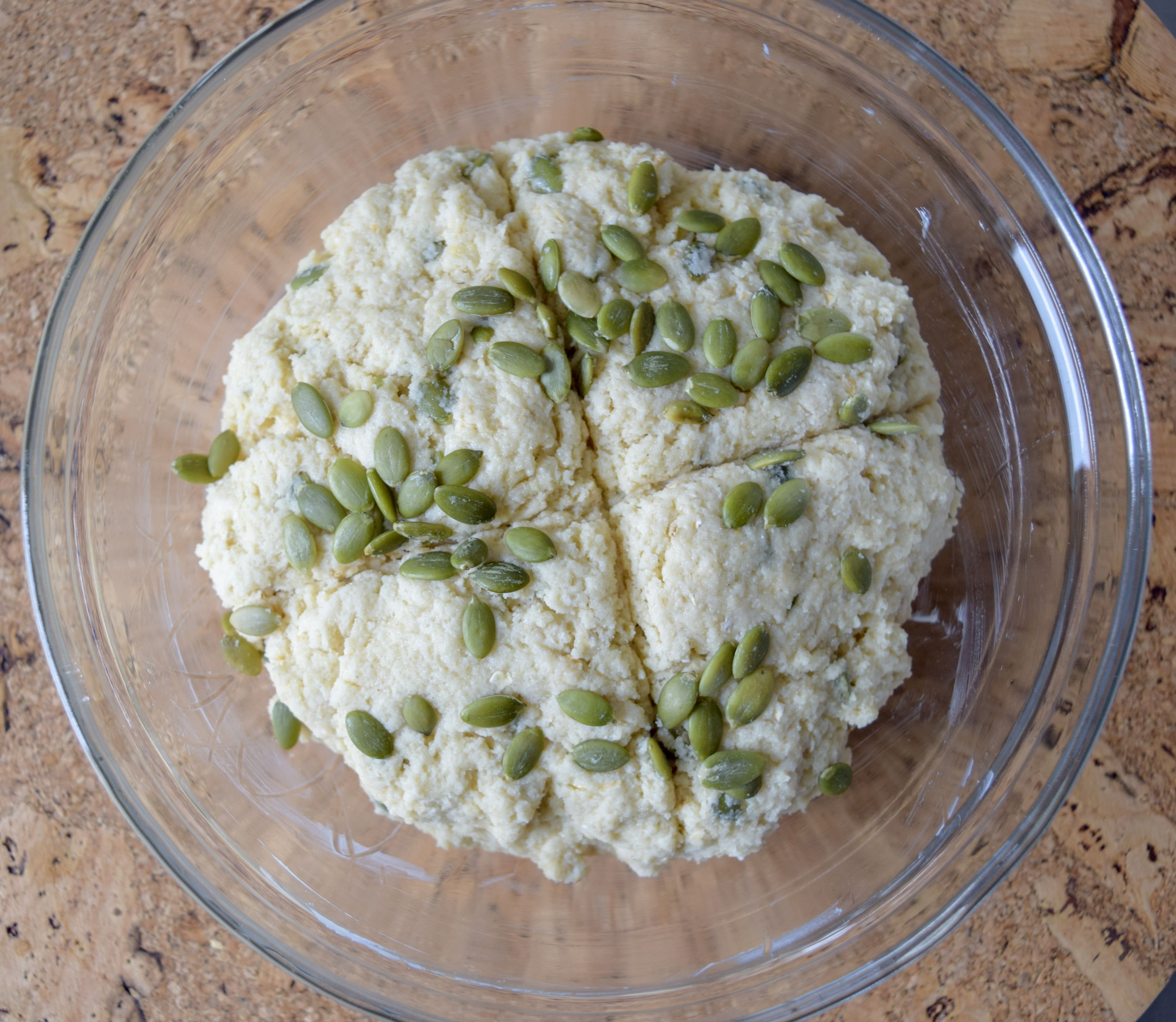 - Place inside the prepared glass bowl. Use a small paring knife to cut the bread into quarters. Sprinkle with the remaining pumpkin seeds and some coarse sea salt. Press down gently.