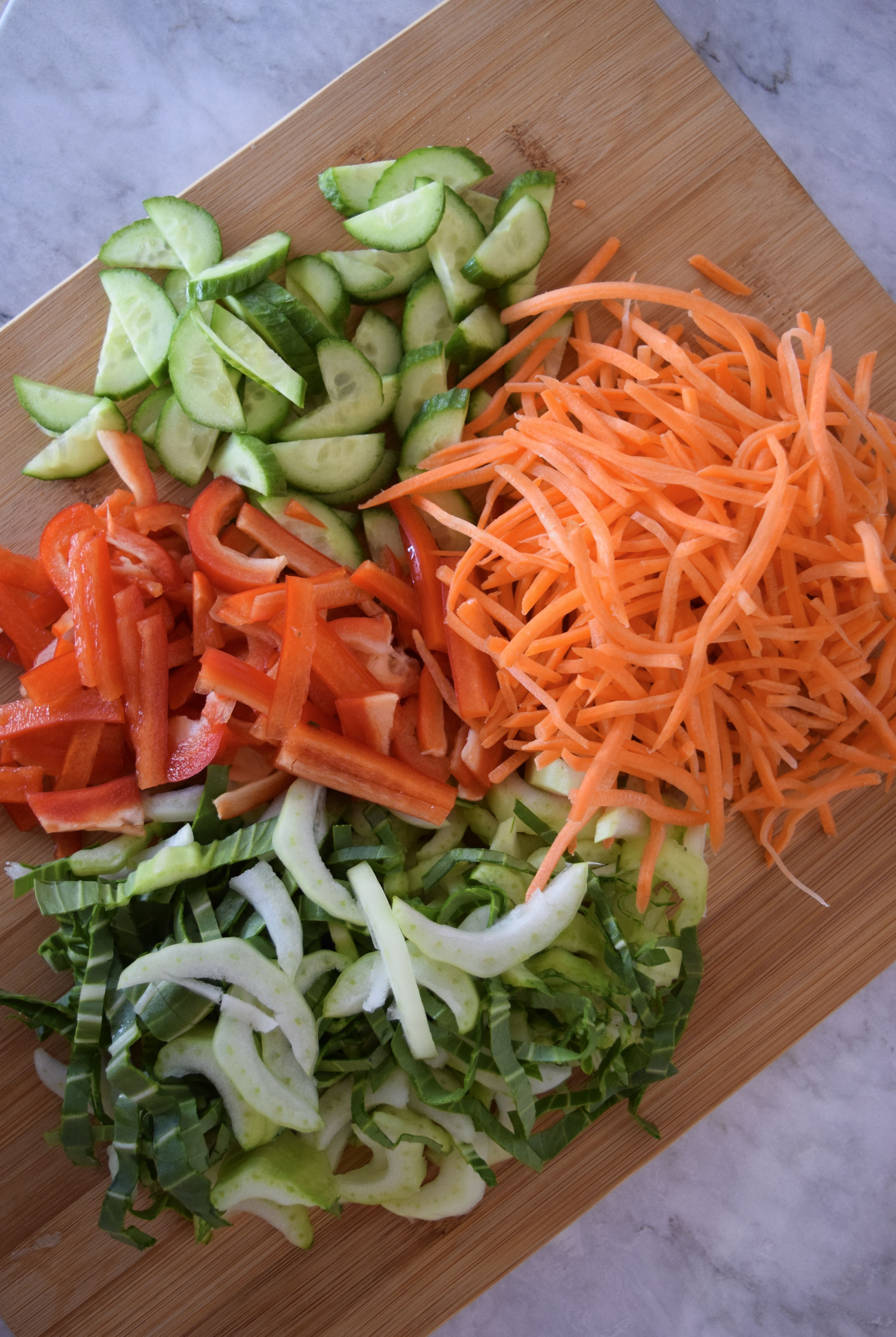 - 2 cups assorted sliced vegetables (my favorite choices: red peppers, carrots, baby bok choy, chopped raw broccoli, cucumber)