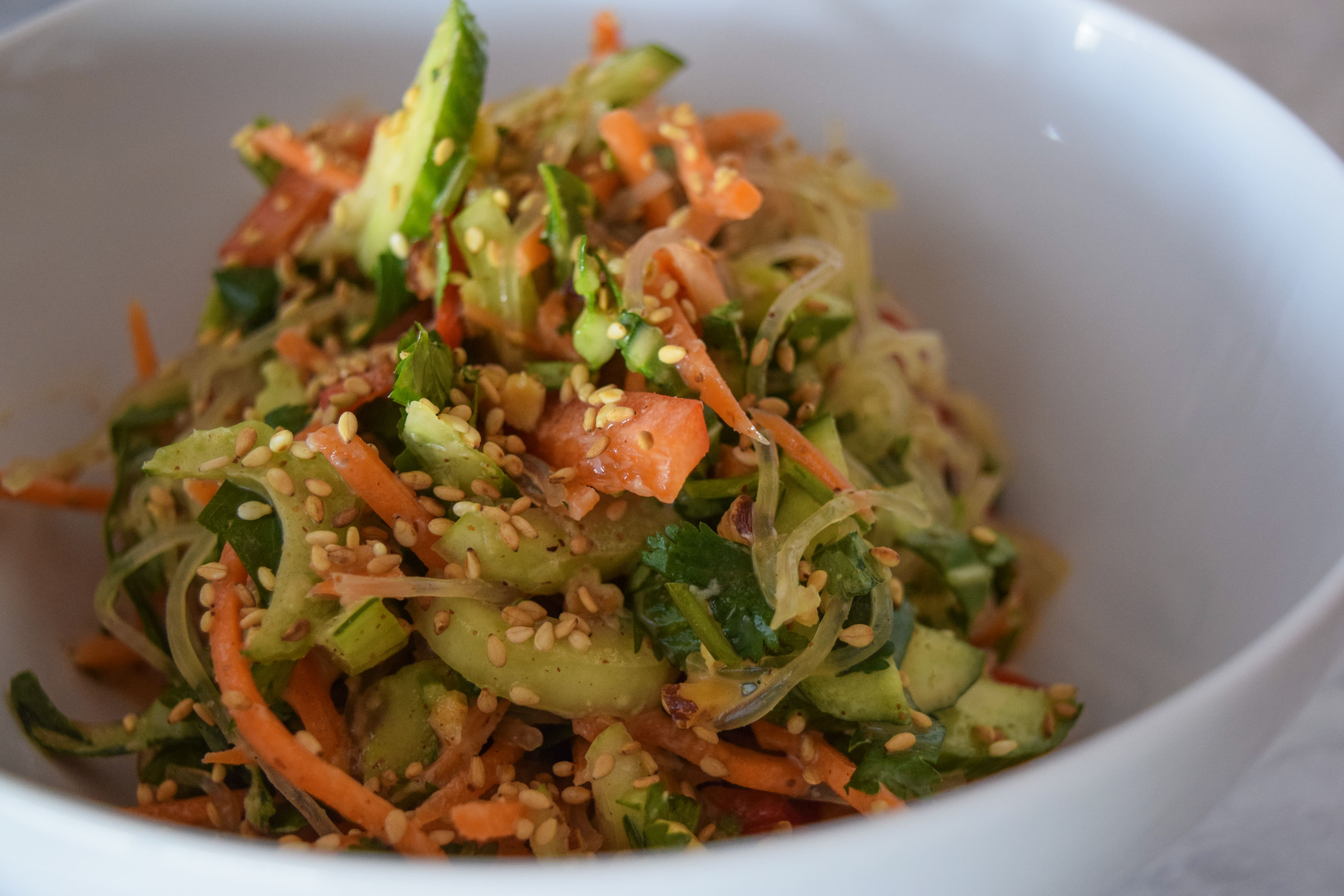 Today I’m writing one of my favorite bowls for you. The base; these crazy noodles made from kelp. Yes, you read that correctly. They’re pretty flavorless, sort of chewy and translucent. I love them because they fill you up with very few calories and they absorb the flavor of whatever sauce you add to them soooooooo make a good sauce and the noodles will taste delicious! So I “cook” the noodles with an acid and a base (vinegar and baking soda) to plump them up and then throw in some chopped veggies and a yummy sauce, any sauce really will work! But in this case it’s a riff on a thai satay sauce, made with almond butter and a few other ingredients.