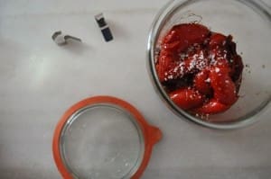 1. Place the quartered red peppers, garlic cloves and the balsamic vinegar in a medium pot (a 3 qt. or 4 qt. saucepan will do). Be sure they are covered in the balsamic vinegar, if they are not add more to the pot.