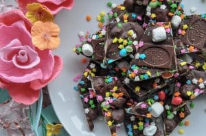 A couple years back I created this recipe for Enjoy Life Foods and I have to say it still makes me so happy. Bright colors, chocolate, yummy little things tucked inside and you’ve got yourself an easy dessert that everyone can help make the day before. It’s basically just melting chocolate, sprinkling with candy of choice and then pressing the rice milk crunch candy squares on top. Let it set, break it apart and enjoy!