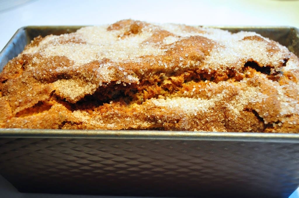 - Fold in the apples and pour into a parchment lined loaf pan. Sprinkle over the demerera-spice mixture to coat the top.