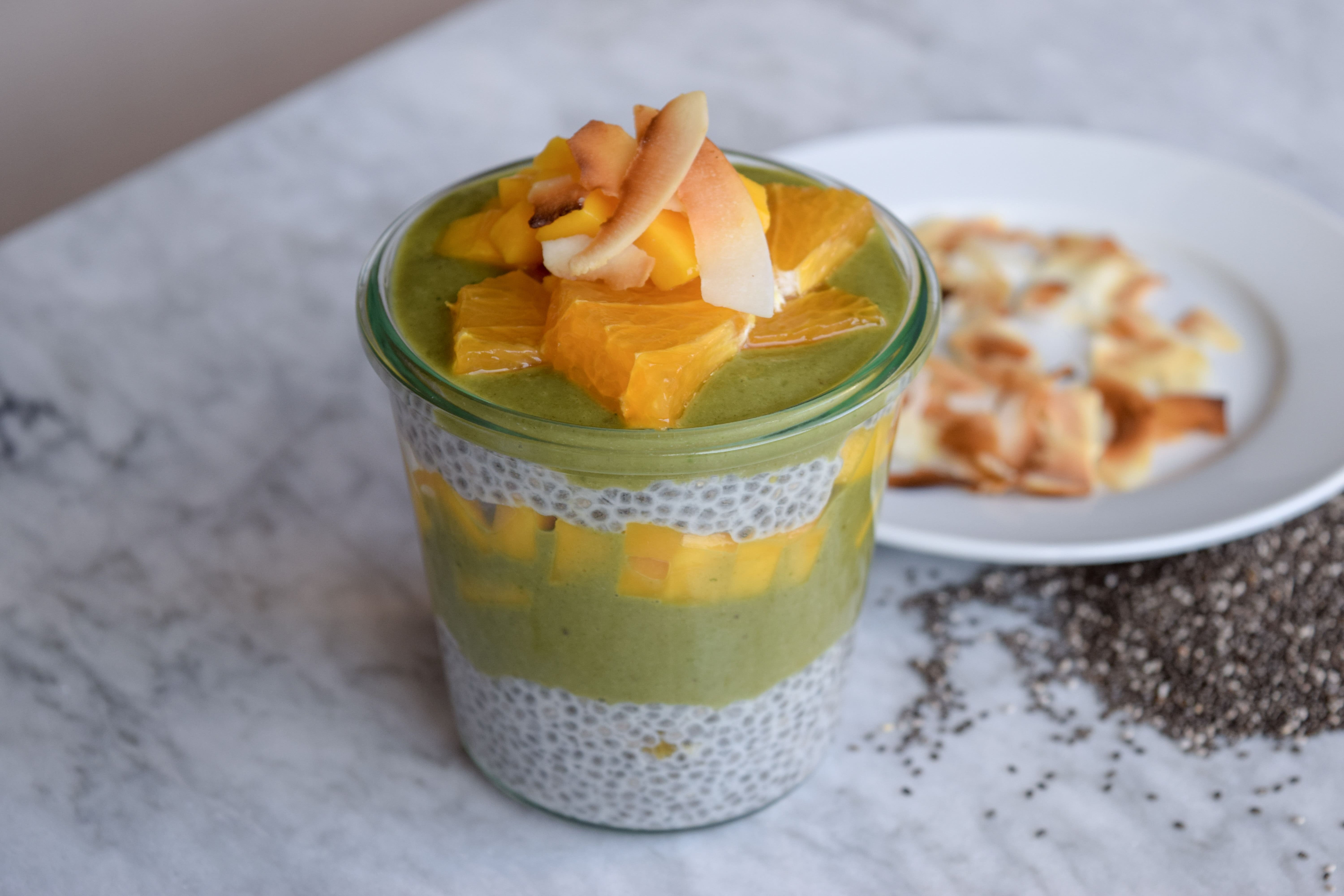 - Layer the chia pudding, chopped mango, chopped orange and green smoothie into two bowls or mason jars. Top with any optional toppings, if using, and enjoy!