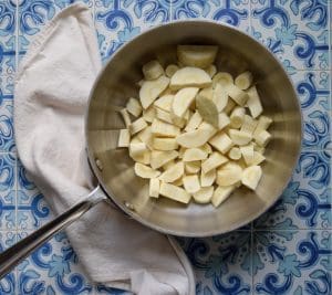 - Trim the ends off the parsnips and discard. Chop into 2″ chunks and add to a saucepan.