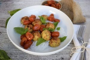 Chicken Parm Meatballs is one of the fan favorite recipes for Drizzle Kitchen clients. They please everyone, they reheat beautifully and are a breeze to put together! The flavor of chicken parmigiana all wrapped up into a juicy and delicious chicken meatball is a fun way to switch up Italian night!