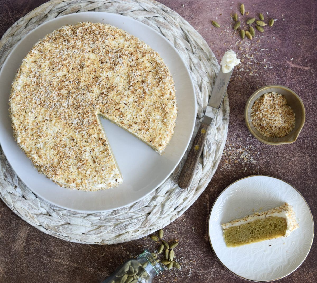 - Place the cake on a large piece of parchment paper set on a flat cookie sheet. Evenly spread the frosting all over the top and sides of the cake (an offset spatula works well for this!) and then press the toasted coconut all over.