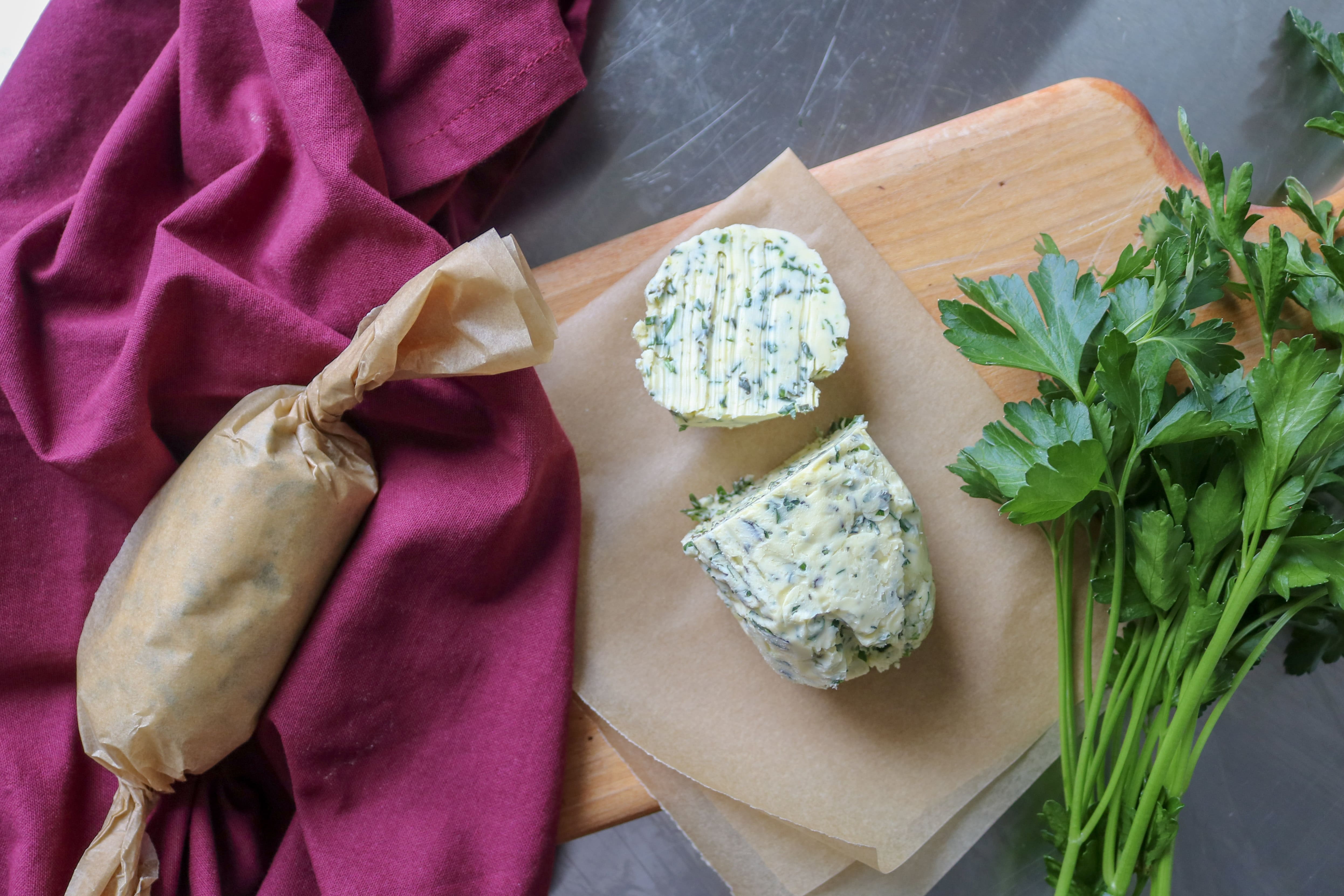 I’m talking about compound butter. I know that might sound like some fancy term but it’s basically butter (or vegan margarine) that has aromatics in it such as garlic, shallot, fresh herbs citrus zest. But really, it can have anything you want! You could do toasted sesame seeds, garlic and ginger for an asian twist or a some reduced red wine and minced shallots for a delicious topper for steaks. But today, with Thanksgiving nipping at our heels, I am going to focus on a very traditional Thanksgiving flavored compound butter.