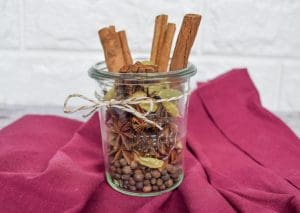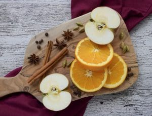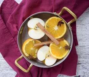 Instead of having to run to your closest spice store or Williams-Sonoma I thought I’d give you simple little recipe full of tasty spices and some fresh fruit. I love to purchase big bags of these spices to keep on hand and put together little gifts for friends as I see them throughout fall and winter. I’ll package up the spices and wrap in a bag with twine and then also give them an apple and an orange so they can have immediate gratification with their simmer pot! Enjoy the smell this delicious simmer pot will waft through your entire home and feel cozy!