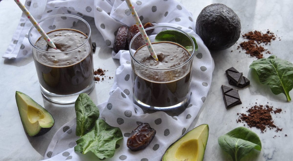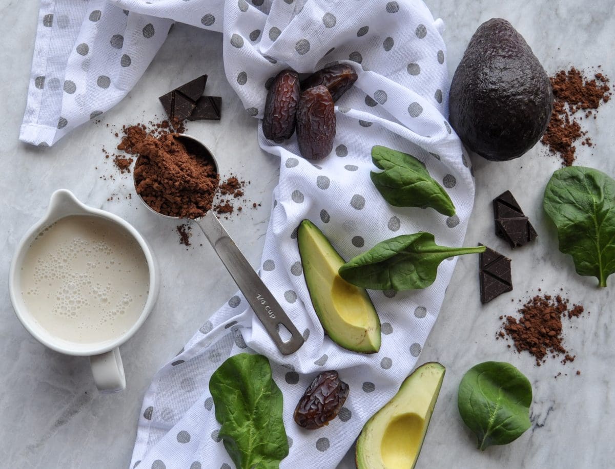 - Add to a blender jar or food processor bowl (preferred): flesh from 1 ripe avocado, 1/3 c. cocoa powder, 10-12 soaked and pitted dates or 1/3 c. maple syrup, 1 c. baby spinach, 1 c. dairy free milk, 1 t. vanilla extract and a tiny pinch of salt.