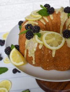 - After cake is cooled, about 2 hours, prepare the lemon drizzle by whisking together the sifted powder sugar, lemon juice and lemon zest. Add a bit more powdered sugar depending on how thick you’d like the drizzle to be. Use a spoon and drizzle all over the top, allowing it to naturally drip over the sides.