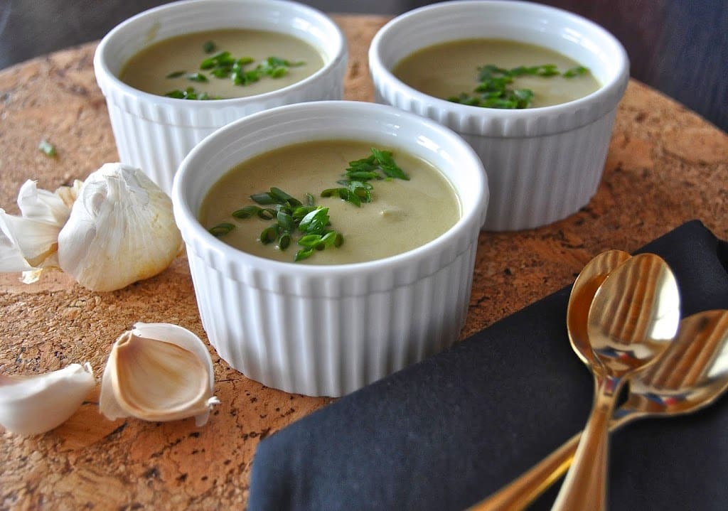 Enter garlic soup. I was recently in New York and I had a lovely garlic soup with chia seeds, farm egg and smoked chili oil. It was so comforting and scrumptious that I knew I had to make my own version at home. And the best part? It’s an unbelievable easy recipe that by nature is vegan. You can sass it up with a little cream or butter if you would like, but it really doesn’t need it! It’s delicious on it’s own right. The real trick is making sure you are using good stock or bone broth. As often as you can, use the bone broth as it’s healing properties far surpass stock!