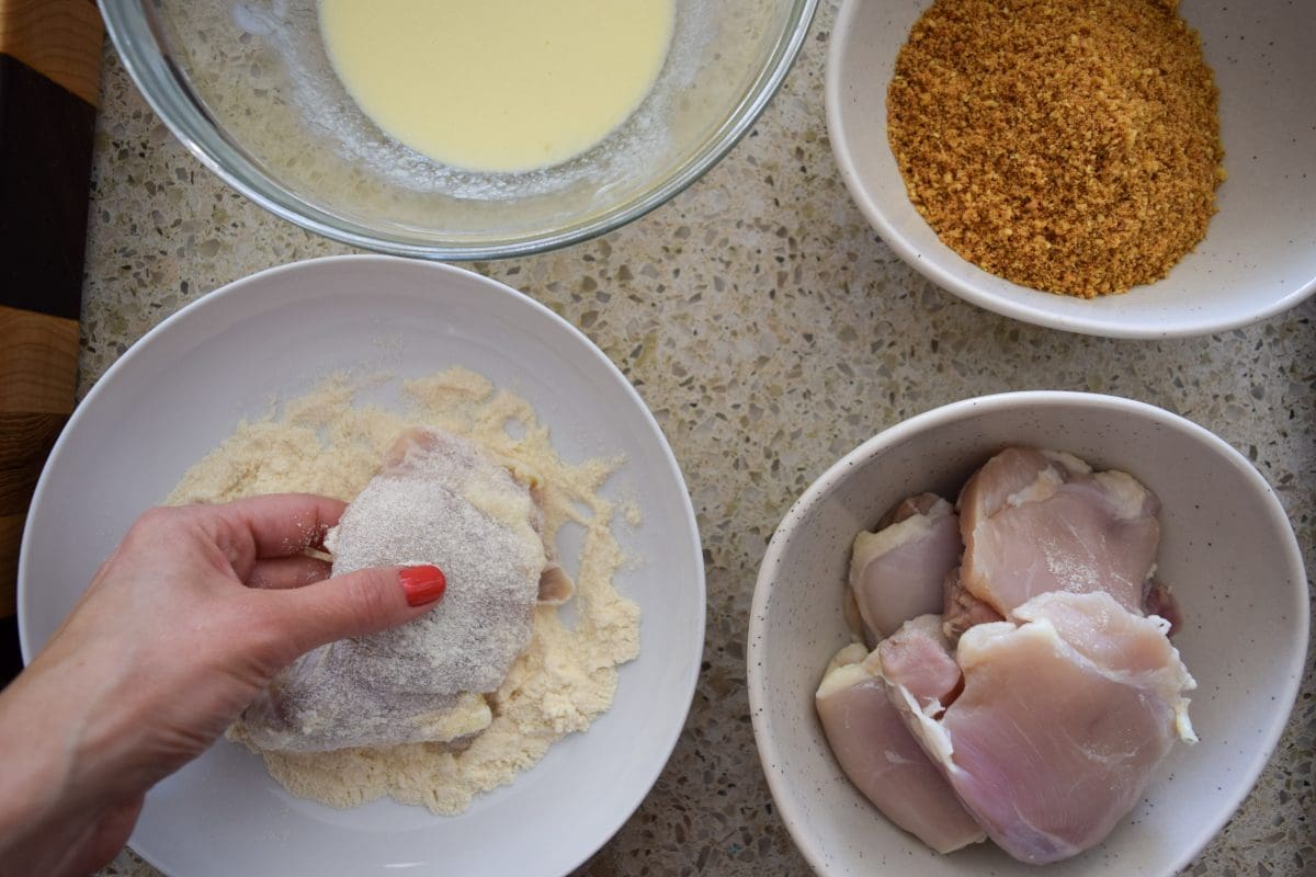 - Prepare your breading process by whisking together 1 egg, ½ c. buttermilk and 1 tsp. garlic powder in one bowl. In another bowl combine the coconut flour, salt, ground paprika and remaining 1 tsp. garlic powder. Lastly, in a third shallow bowl pour the breadcrumbs in.