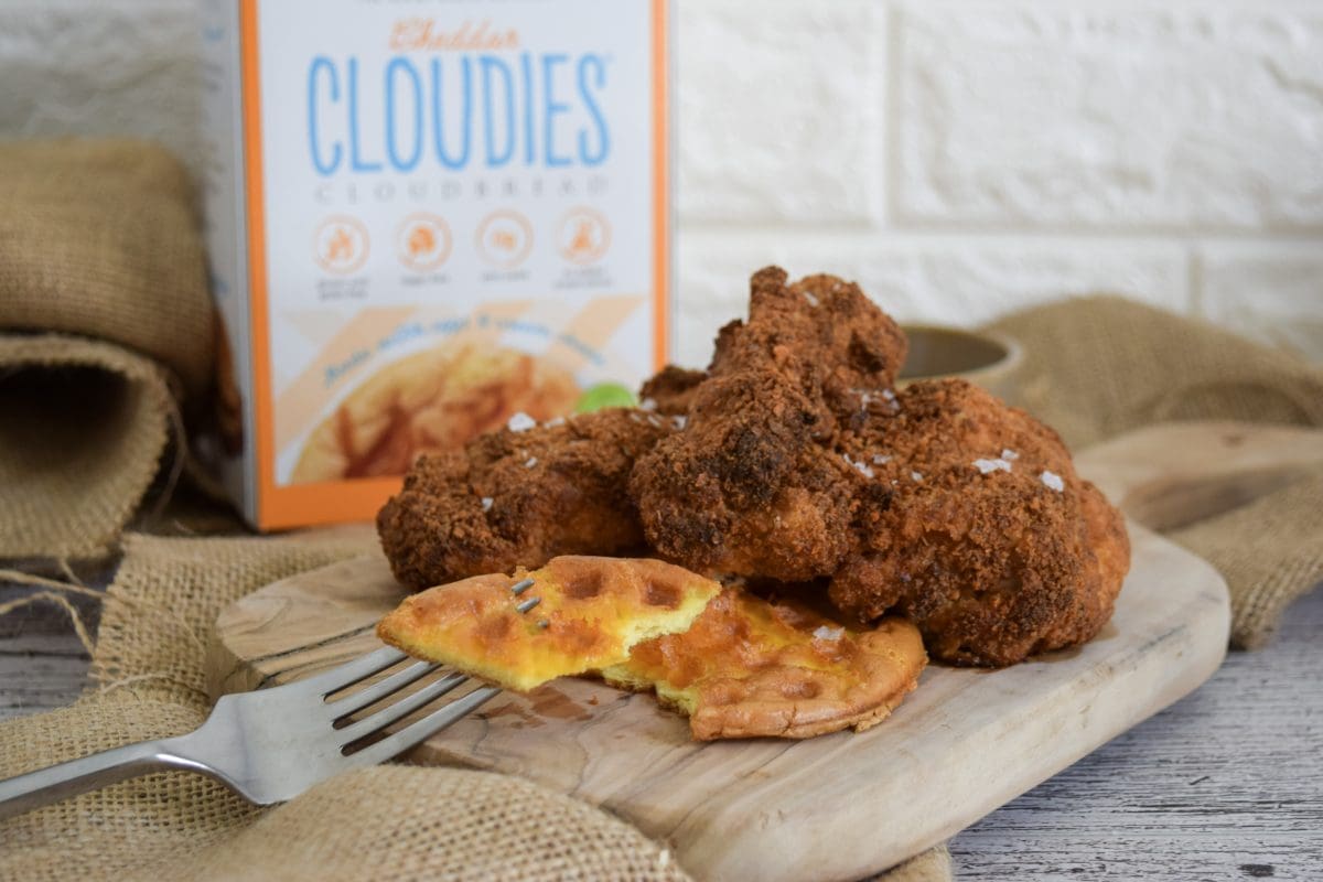 So be sure to stock up on Cloudies and save this recipe for the next time you’re hosting brunch or maybe want a fun breakfast for dinner. And don’t forget to make it your own! Add some herbs or maybe put a light drizzle of hot honey on top. A drizzle of maple syrup is also a delicious idea and if you are a bacon lover then some super crispy bacon strips would really make this extra tasty. However you do it, have fun and enjoy your new lightened up version of Chicken and Waffles!
