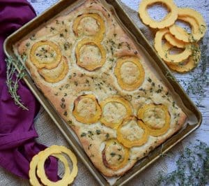 - Lay the sliced delicata on top in a fun pattern and gently press down. Add the thyme to the top of the dough and gently press down on that as well.