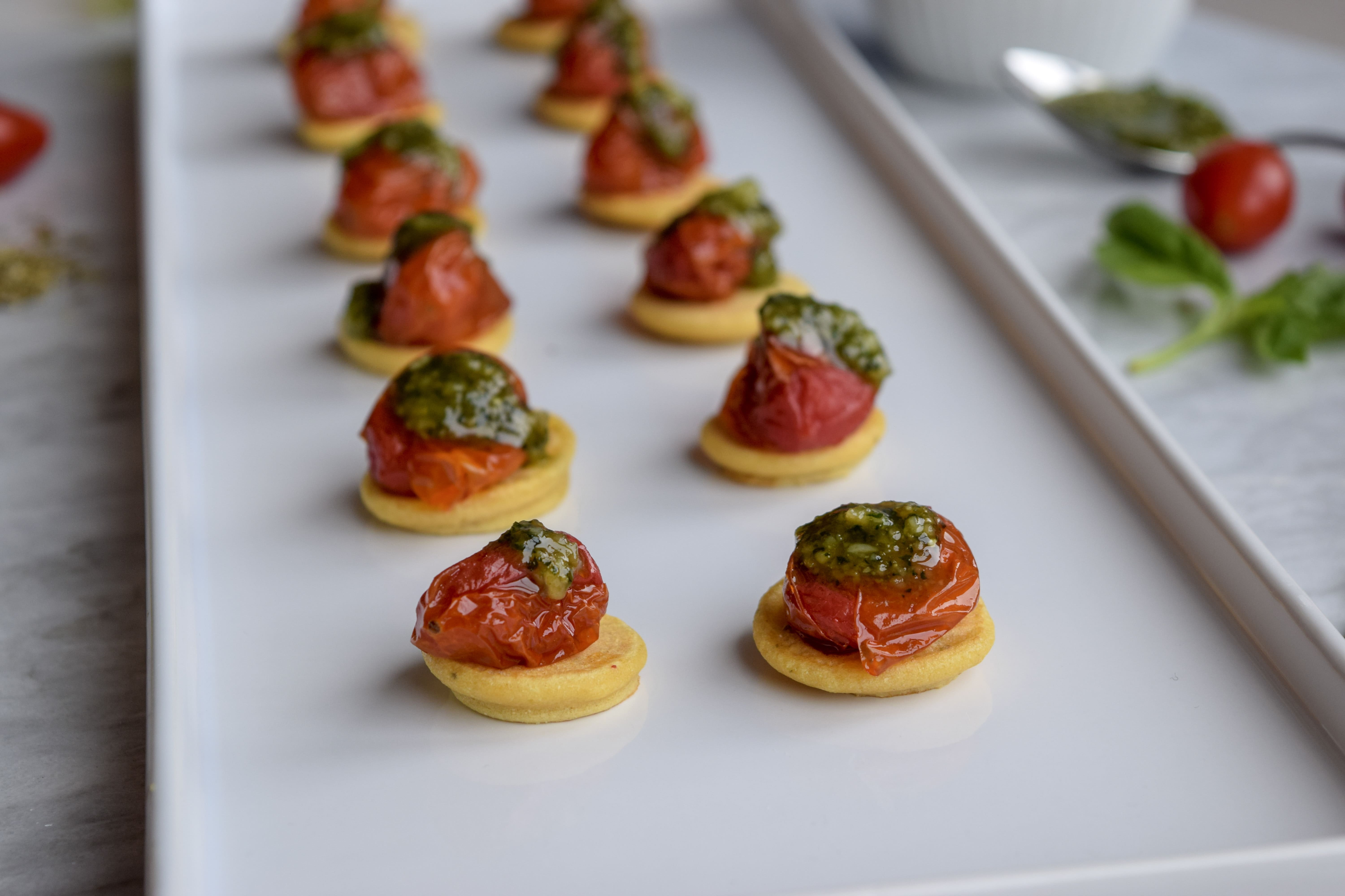 - To assemble, top each little pancake with a roasted tomato and then a small dollop of the pesto. Enjoy!