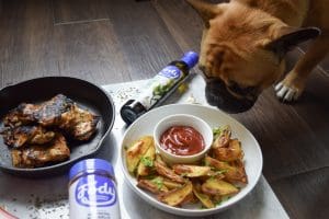 The potato wedges can be done the day before as well and then just reheated before serving. Or, if you are making the day of they are also super duper easy and will totally satisfy that chewy, garlicky (without garlic!) fry craving.