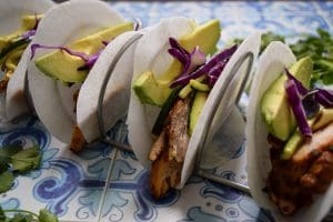 - Now assemble your tacos! Jicama wrapper, sliced chicken, zucchini, purple cabbage, avocado, lime and cilantro. How delicious is that?