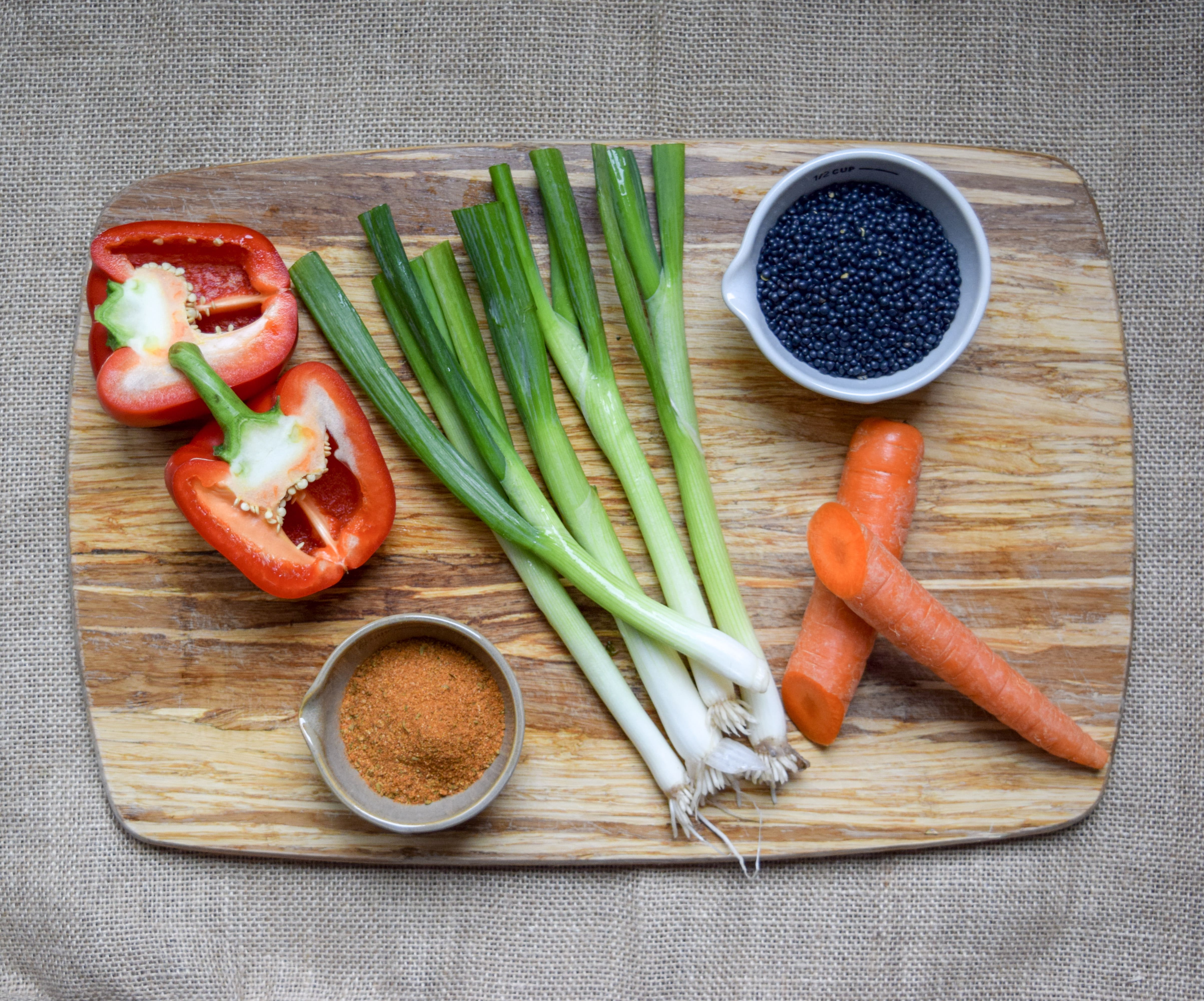 - In a skillet, sauté carrots, red pepper and green onion. Once vegetables are soft and lightly caramelized, add in drained lentils and continue to sauté. Sprinkle in taco seasoning and water. Cook an additional few minutes until the taco seasoning has thickened.