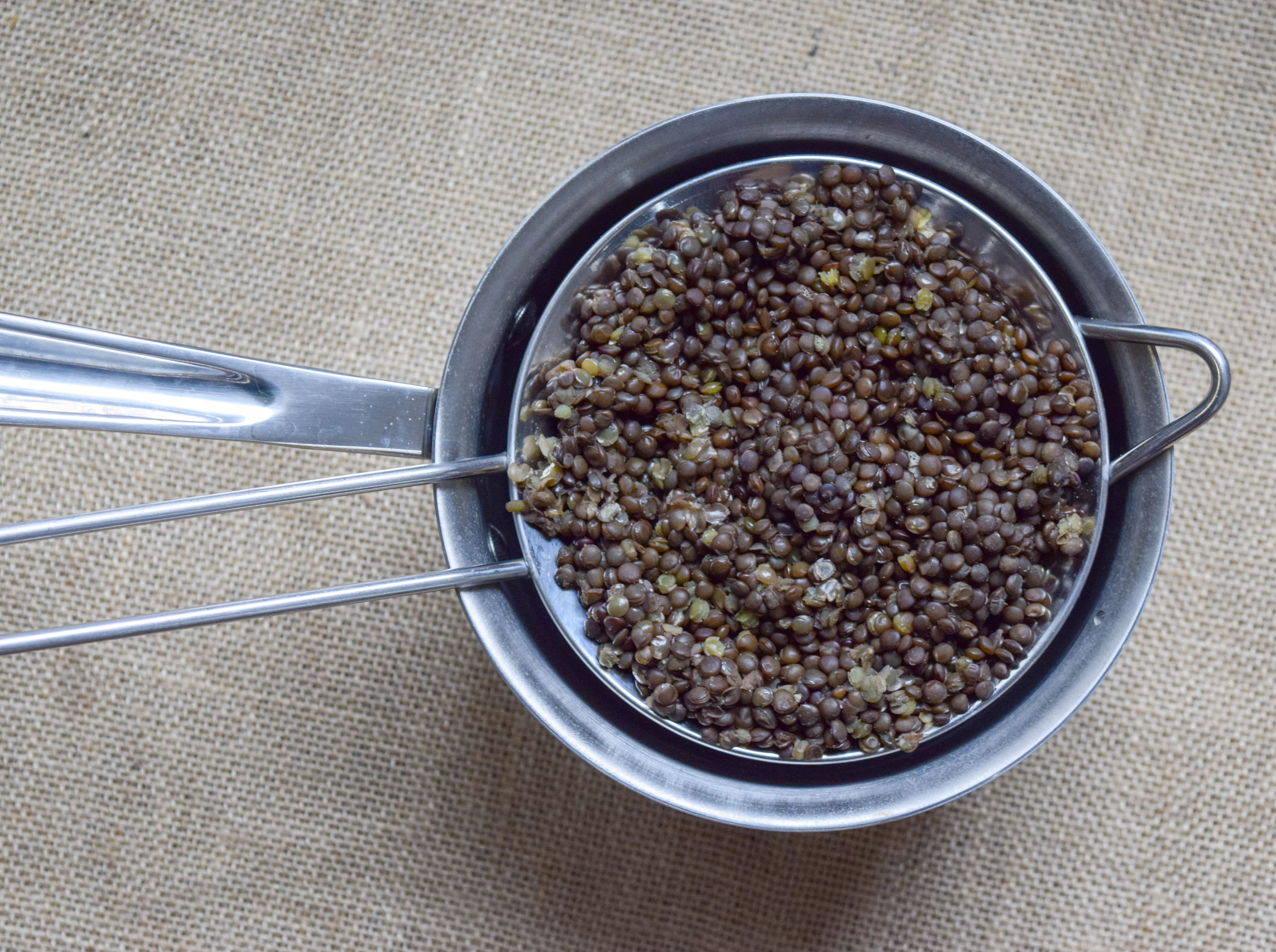 - To cook the lentils, bring a pot of water to a boil. Once water boils add in a pinch of salt and cook lentils until al dente, about 15-20 minutes. Drain access water and cool, set aside.