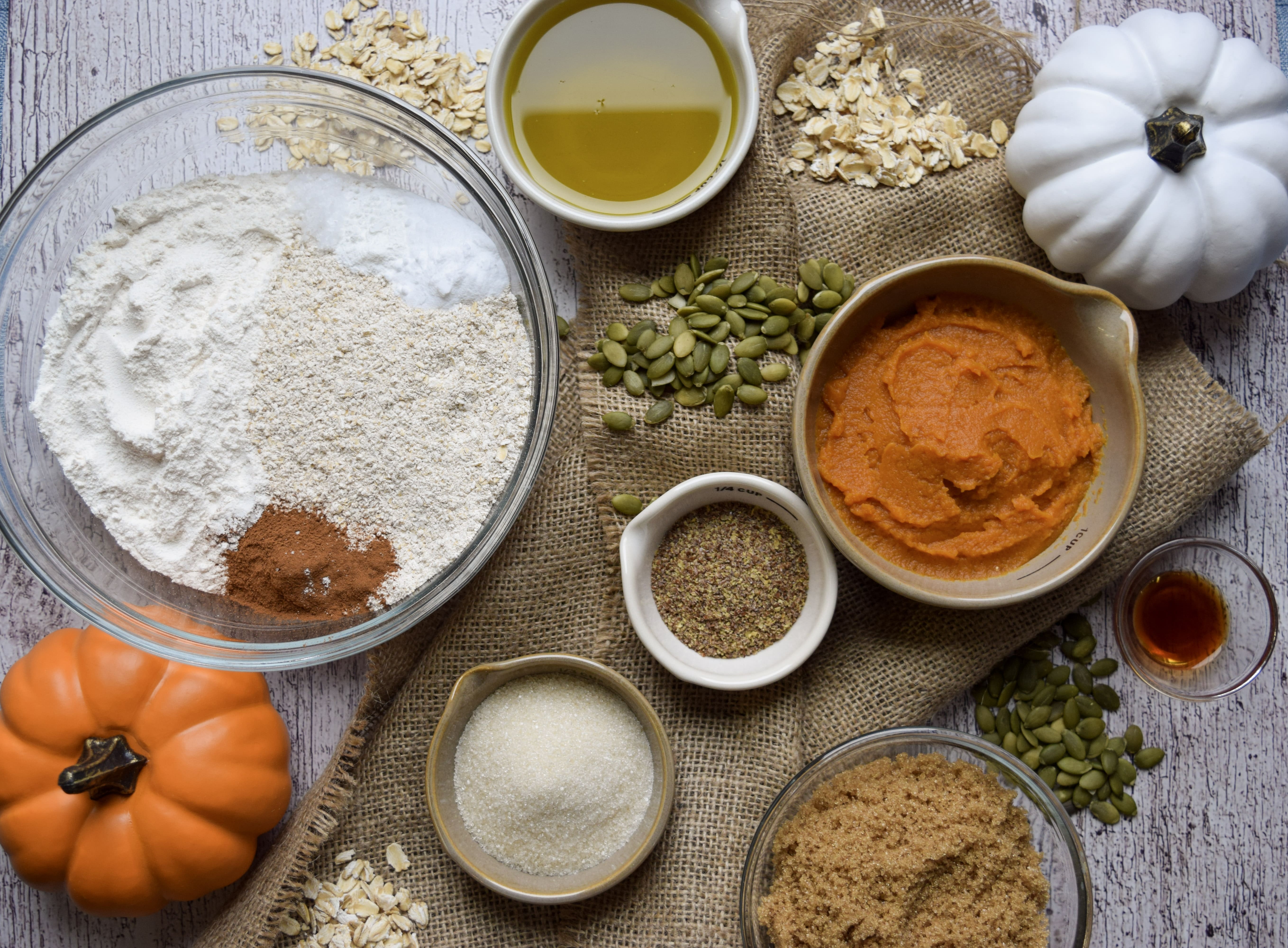 - In another medium bowl whisk together the pumpkin puree, flax eggs, olive oil, brown sugar, granulated sugar and vanilla.