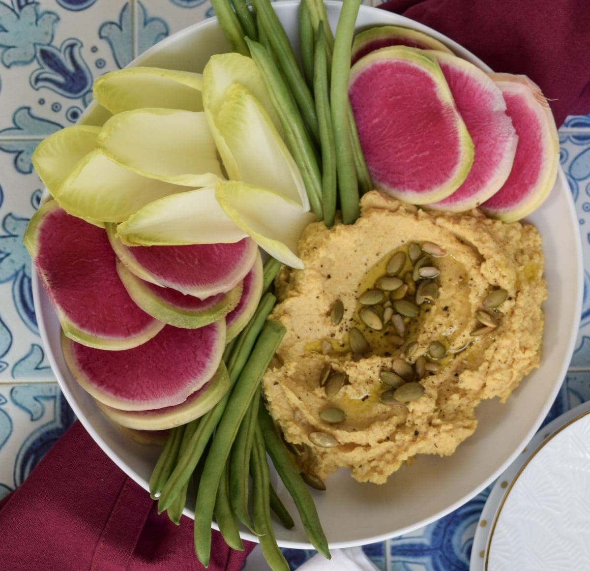 - Scrape into a bowl and top with a nice swirl of olive oil and the toasted pumpkin seeds. Enjoy with your favorite chips and cut vegetables!