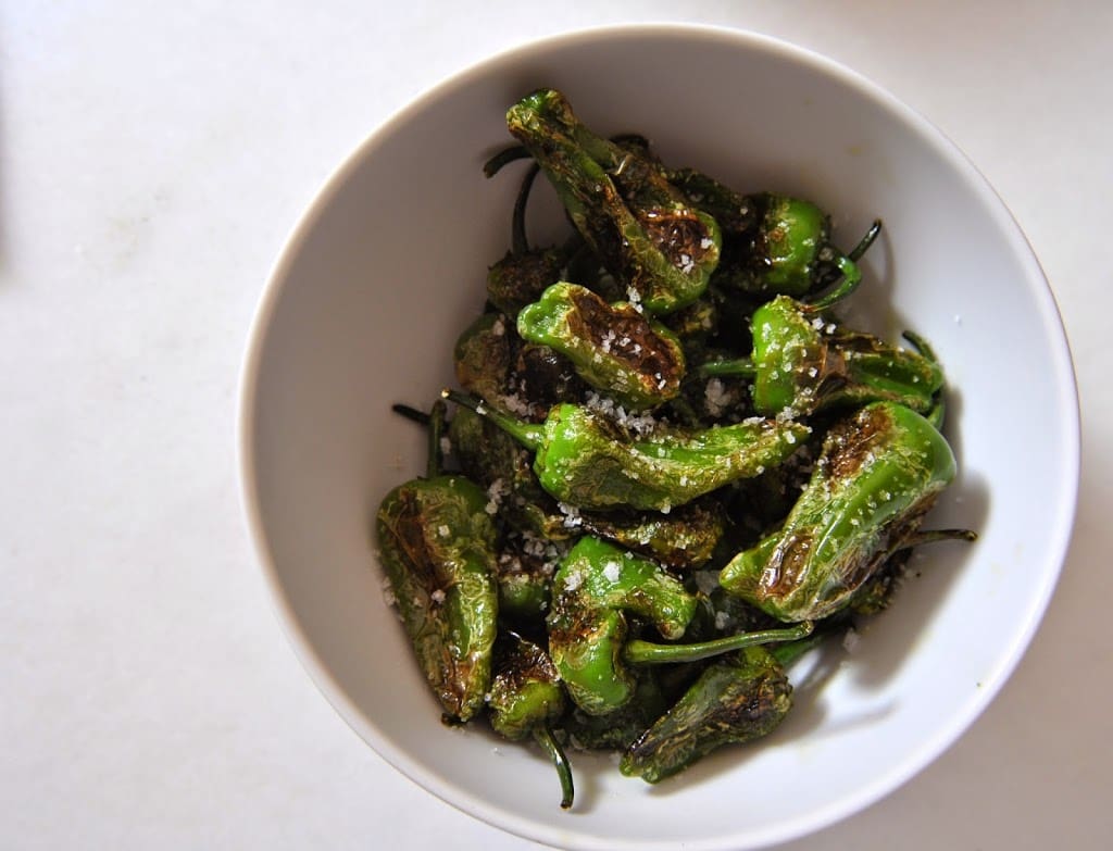 During our time in Spain we always make sure to have sunset cocktails on the roof of the house. The girls love to make fresh orange juice and we, obviously, have campari in ours. There is always a snack, as well, and more often than not it consists of a big bowl of sautéed padrón peppers we have picked up from our favorite fruit and vegetable lady, Peppa. These little green delights couldn’t be easier to make and easier to nibble on. They aren’t spicy (well, if picked at the right time they shouldn’t be spicy) and hit with some really nice sea salt they are such a satisfying snack!