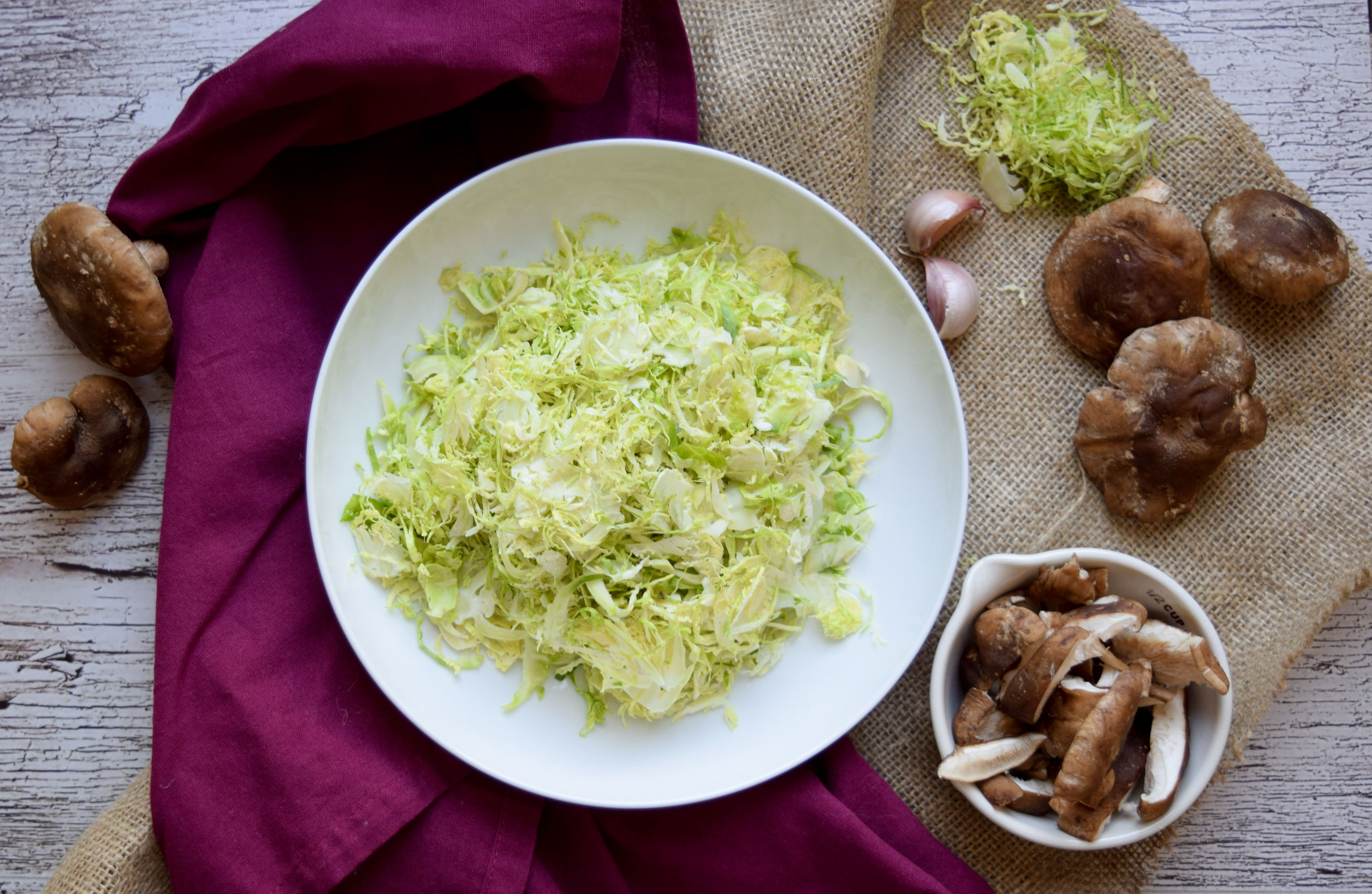But if you get just enough of a light char from roasting or caramelization on them from a good saute it completely changes their texture and their flavor. It turns them into an entirely different vegetable! In this version of shaved brussels I added some sliced shiitakes for that awesome umami flavor, umami is the savory flavor you get typically from things like meat, pork, but also from mushrooms!