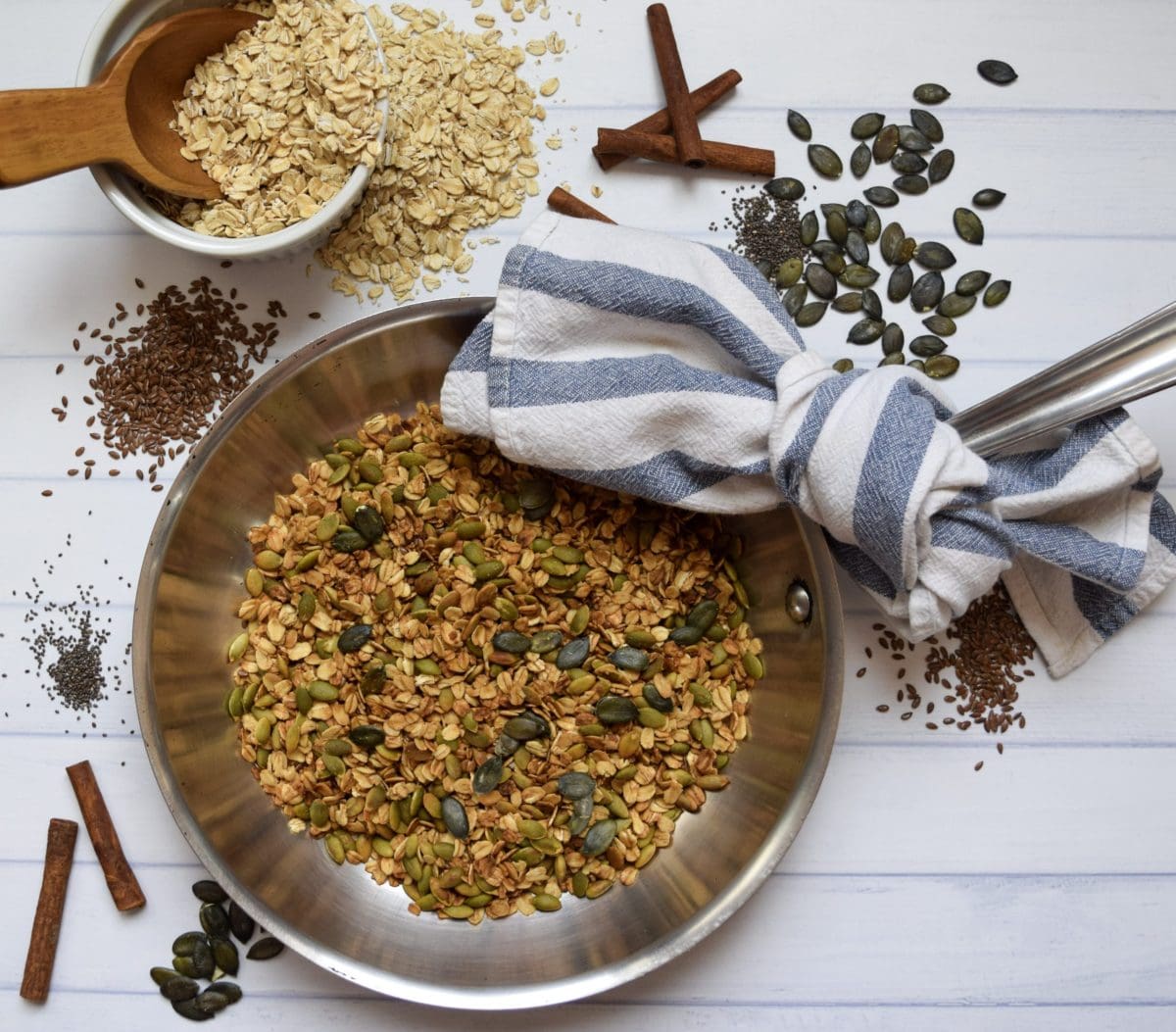 - Add the oats and the seed/nut mixture and toss to coat completely with the maple syrup mixture. Continue stirring occasionally for 7-8 minutes over medium-low heat until toasted.