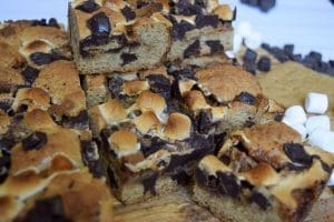 - Using damp hands, press 2/3 of the dough into the bottom of the lined 9×13 pan. Top with the marshmallows, remaining chocolate chips and crushed graham crackers.
