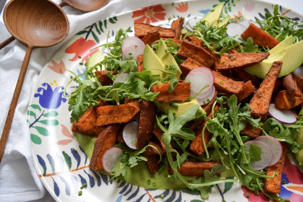 Now, if you have an allegiance to the classic flavors of celery, egg, potato and mayo that’s cool! But, I’m sure once you move on to bigger and bolder flavors you’ll realize what you were missing all these years. Enter my southwest sweet potato salad. It’s spicy, creamy, cool and hot all at the same time. Mellow heat from hot smoked paprika, cool crunch from arugula and radishes, creaminess from an avocado-herb dressing plus slices of avocado and it’s just a dream to have on your plate!