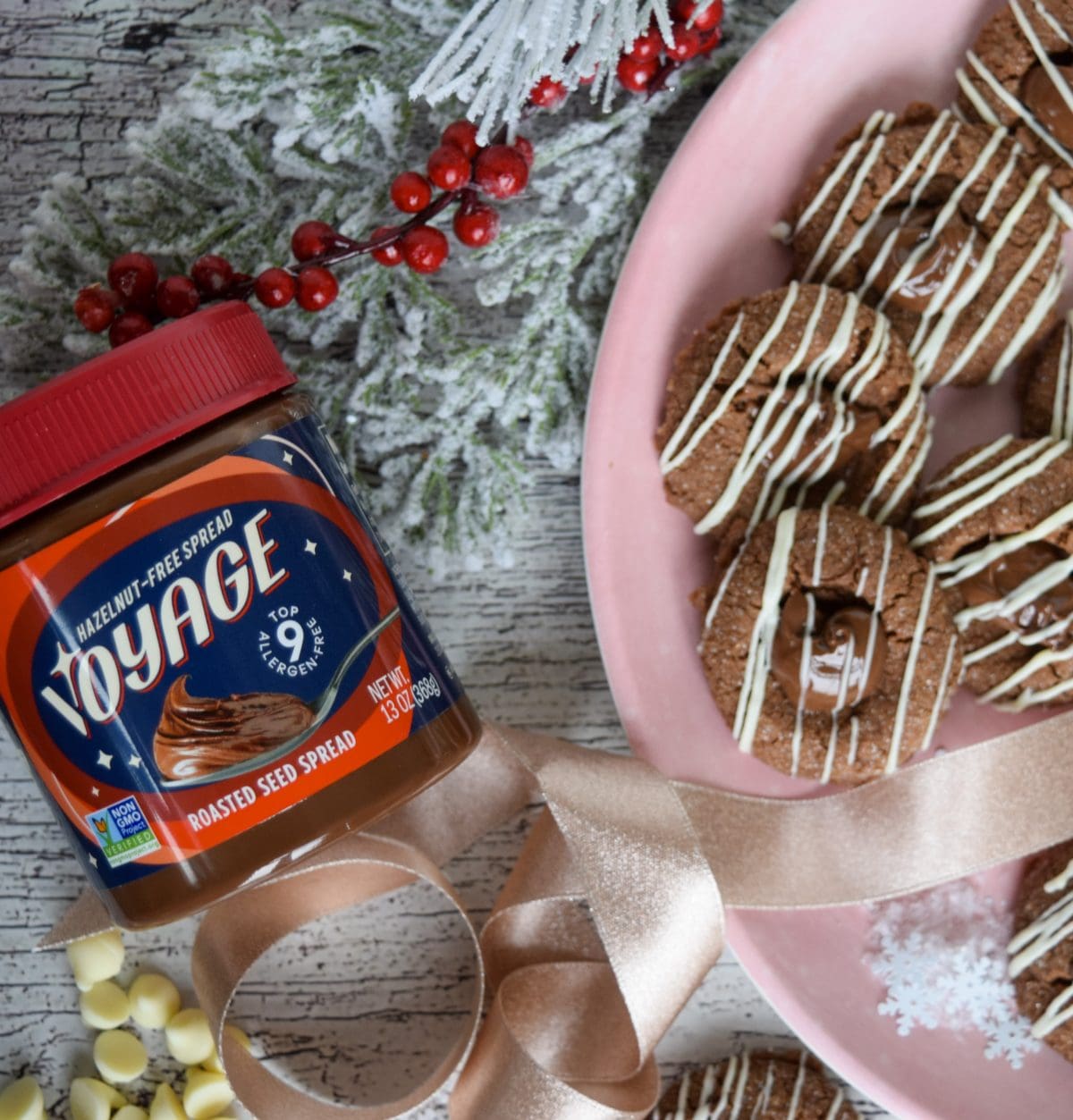 And today, to kick off our 12 days of Cookies I give you Sparkling Chocolate Thumbprints filled with Voyage Hazelnut Free Chocolate Spread. Now, of course if you are able to and prefer Nutella go for it! Or if you’d rather fill with raspberry jam, yum! Sunflower seed spread, peanut butter, berry jams are all super delicious fillings for this if you’d prefer that instead. For me? I’m loading up with this new spread from Voyage so I can safely bring it to holiday events!