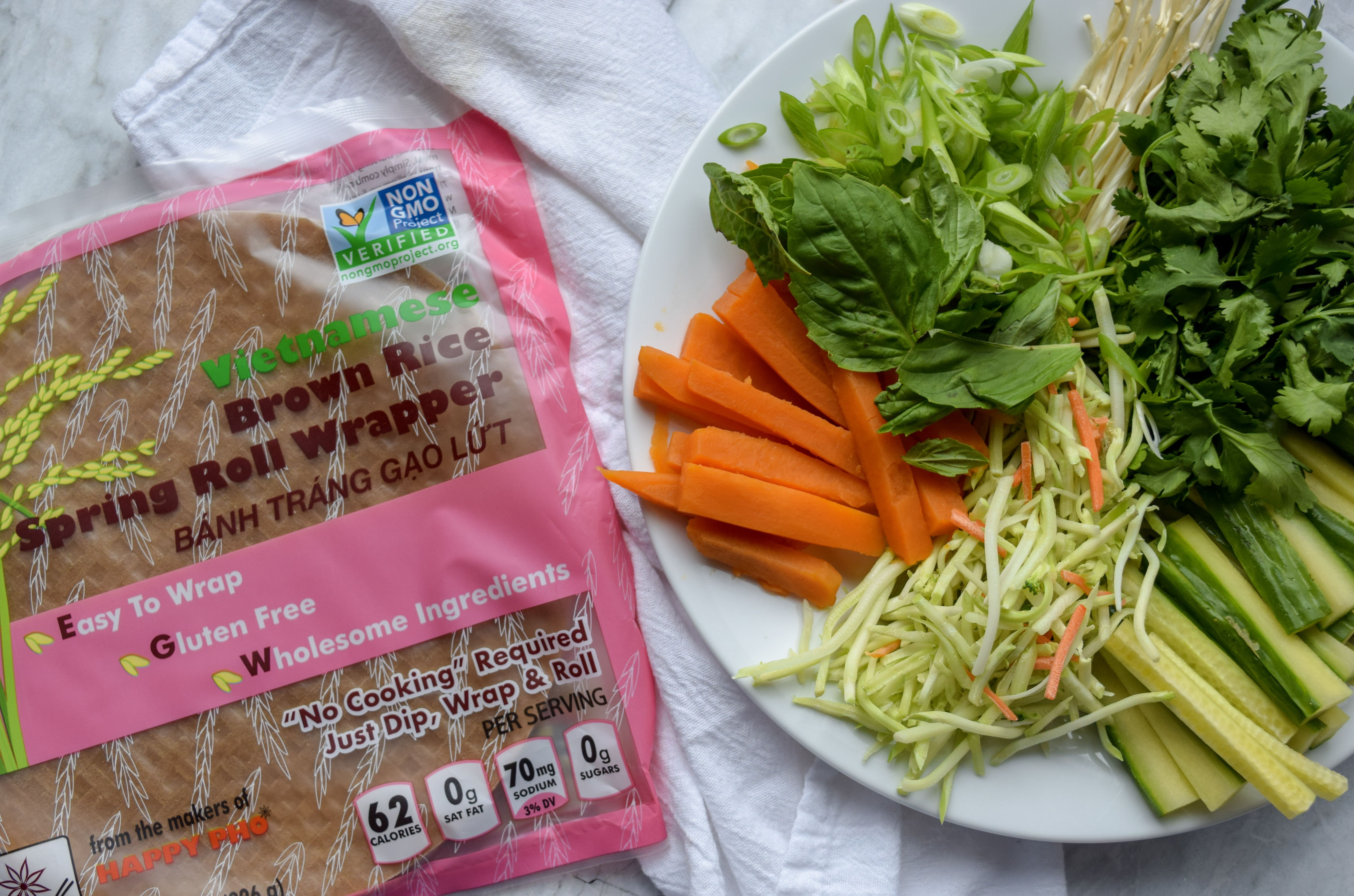 I also found, instead of white rice paper, a new brown rice paper to wrap the veggies in! It soaks easily, holds up to the filling and tastes delicious. More fiber and the same taste? Thank you!