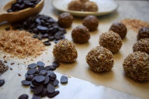 - Scoop out with a spoon or a scooper, about 1-ish Tbsp. in size, roll gently into a ball and, if using, toss with toasted coconut.