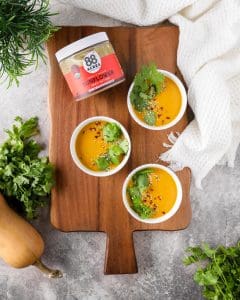 There is something warm and cozy (and a little fancy!) about starting your Thanksgiving meal with soup. Especially when it’s thick, creamy and all while being dairy free! This recipe uses the 88 Acres Maple Sunflower Seed Butter in lieu of cream. Not only does it help with dairy free creaminess but it also adds a bit of protein, iron and unsaturated fats. Win-win! Butternut squash is one of my favorite seasonal vegetables and it works beautifully in this easy recipe.