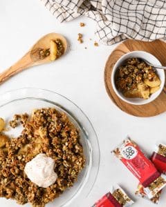 - Unwrap the 5-6 apple ginger bars and break into pieces or measure out 9oz of Apple Ginger Seed’nola. Evenly distribute bars over apple filling.