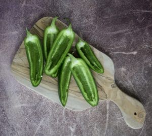 - Slice the jalapeños in half, trying to keep a bit of the stem on both halves.