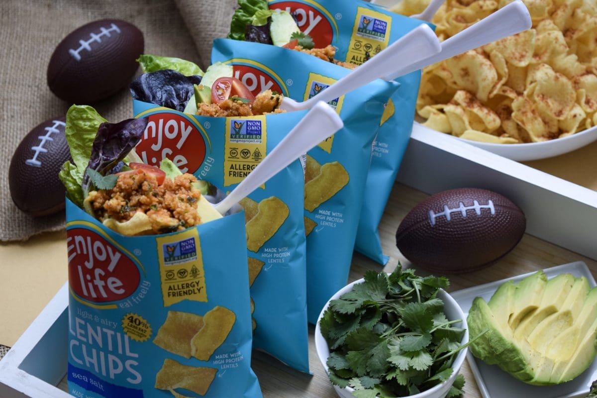 Recipe originally created for Enjoy Life Foods. I LOVE using their individual bags of Lentil chips instead of corn chips as the base. I also made this vegan by using crumbled and sauteed veggie burgers but my most favorite way is to use cooked beluga/black lentils instead of ground beef (you make the recipe the exact same way!).