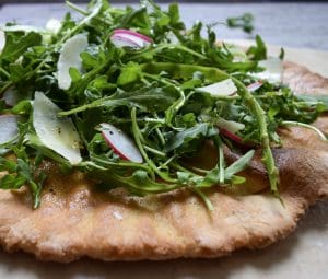 - Place the arugula salad on top of the pizza crust, add either the sliced avocado or the shaved parmigiana and then finish with radishes.