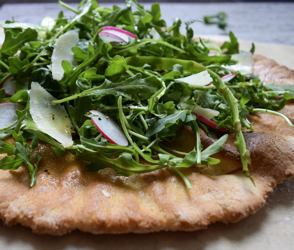 - Place the arugula salad on top of the pizza crust, add either the sliced avocado or the shaved parmigiana and then finish with radishes.